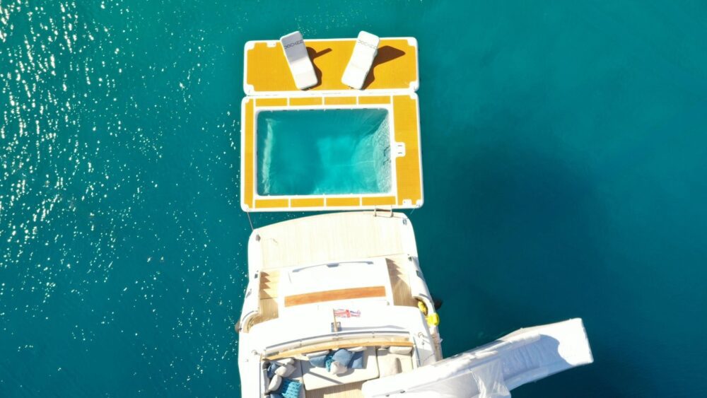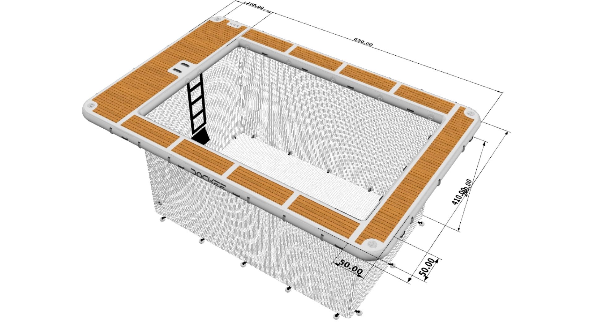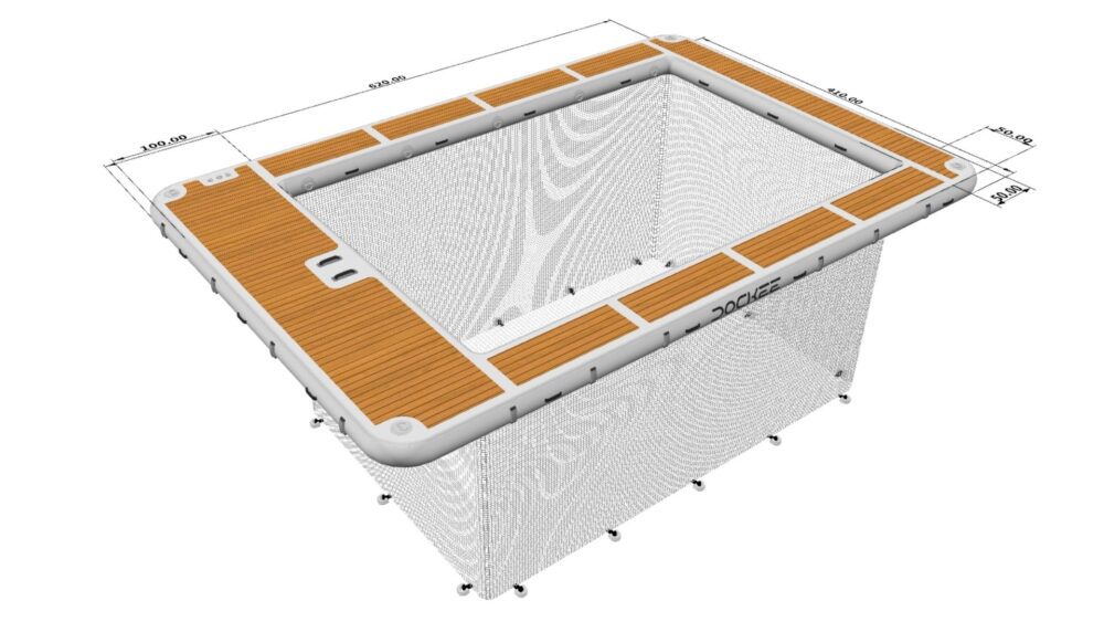 Dockee Luxury Sea Pool 6.16 offers a spacious and secure floating swimming area directly behind your yacht. Measuring 616 x 410 cm (20’2” x 13’5”) with a depth of approximately 240 cm (7’10”), it features a generous swim zone and integrated lounging space, making it ideal for sunbathing, relaxing, or enjoying uninterrupted time in the sea.
