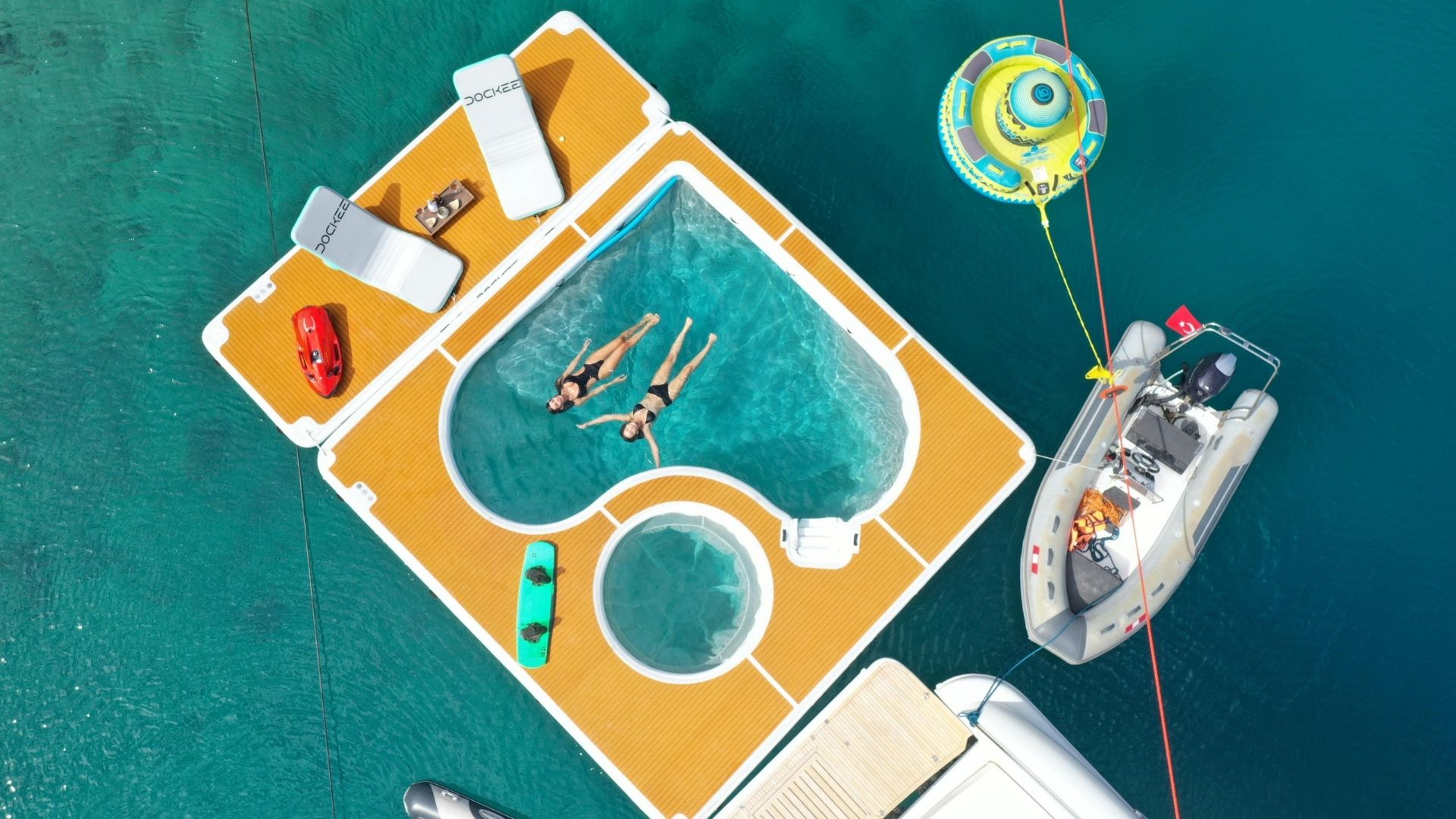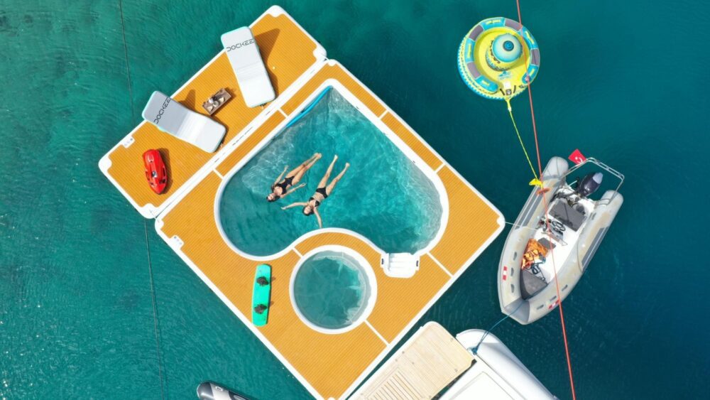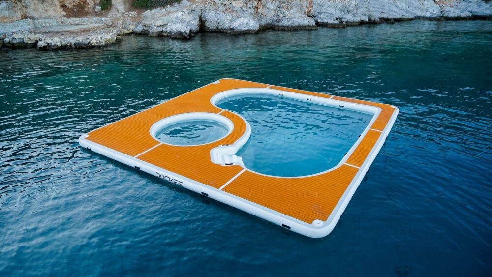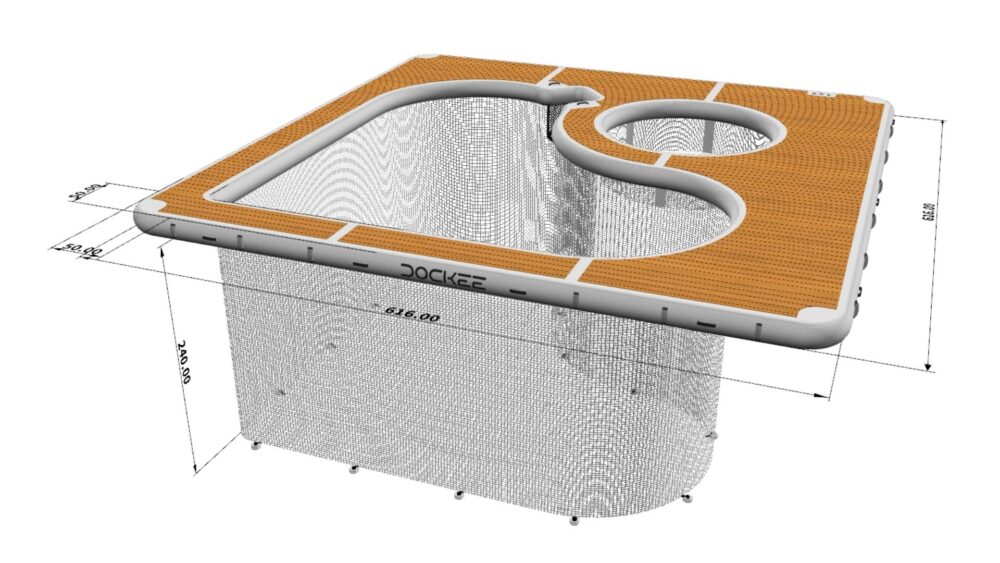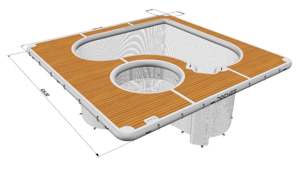 Dockee Luxury Sea Pool offers a safe, elegant, and spacious swimming area directly behind your yacht. With generous dimensions of 616 x 616 cm (20’2” x 20’2”), it combines a protected swim zone and integrated lounge area for sunbathing, relaxing, and carefree enjoyment on the water.
